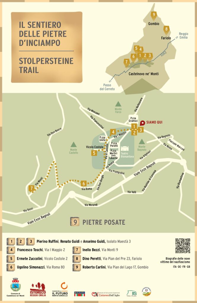 A Castelnovo ne’ Monti sono presenti diverse Pietre d’Inciampo. Una Pietra d’Inciampo è un sanpietrino coperto da una lastra di ottone di 10 per 10 cm, installato nella pavimentazione urbana, su strade o marciapiedi. Chi ci si imbatterà, si chinerà e si troverà di fronte a una nuova storia da conoscere.