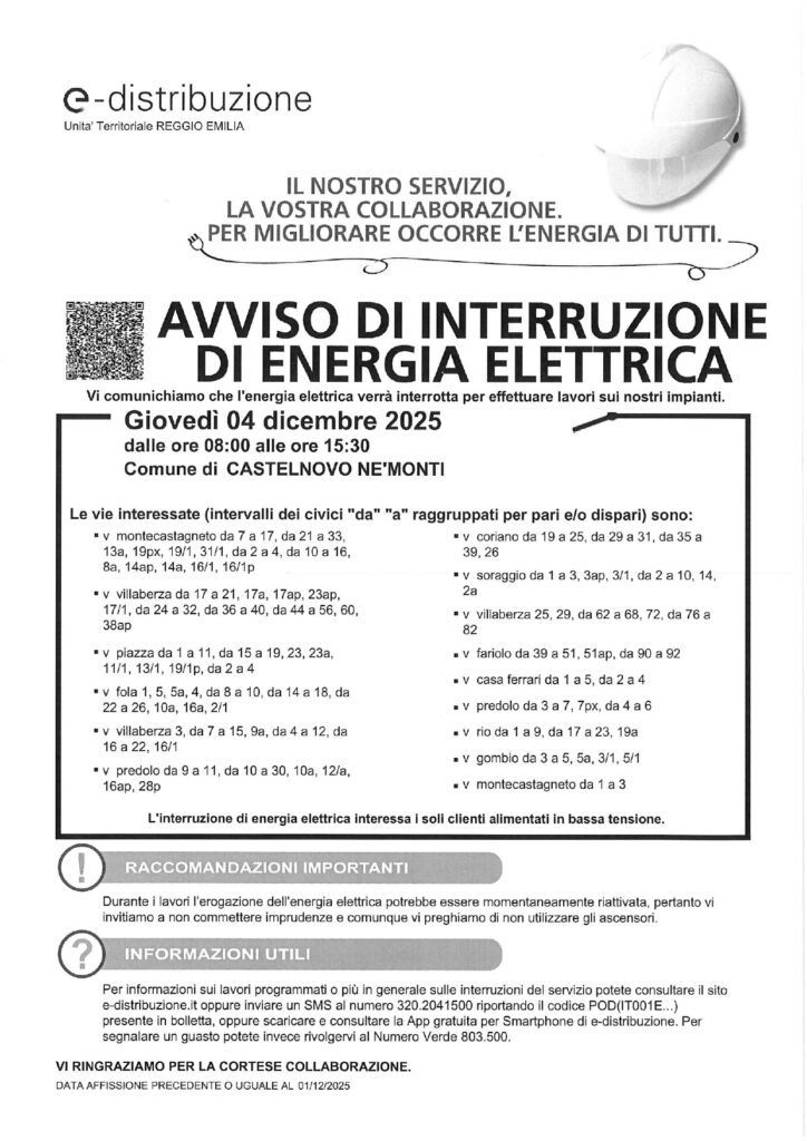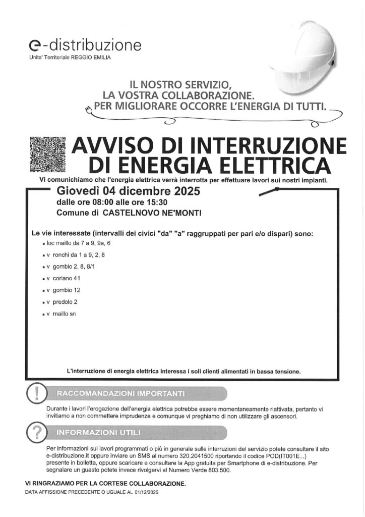 Enel segnala possibili interruzioni nella distribuzione di energia elettrica il 4 dicembre tra Villaberza, Montecastagneto, Gombio, Predolo e Maillo.