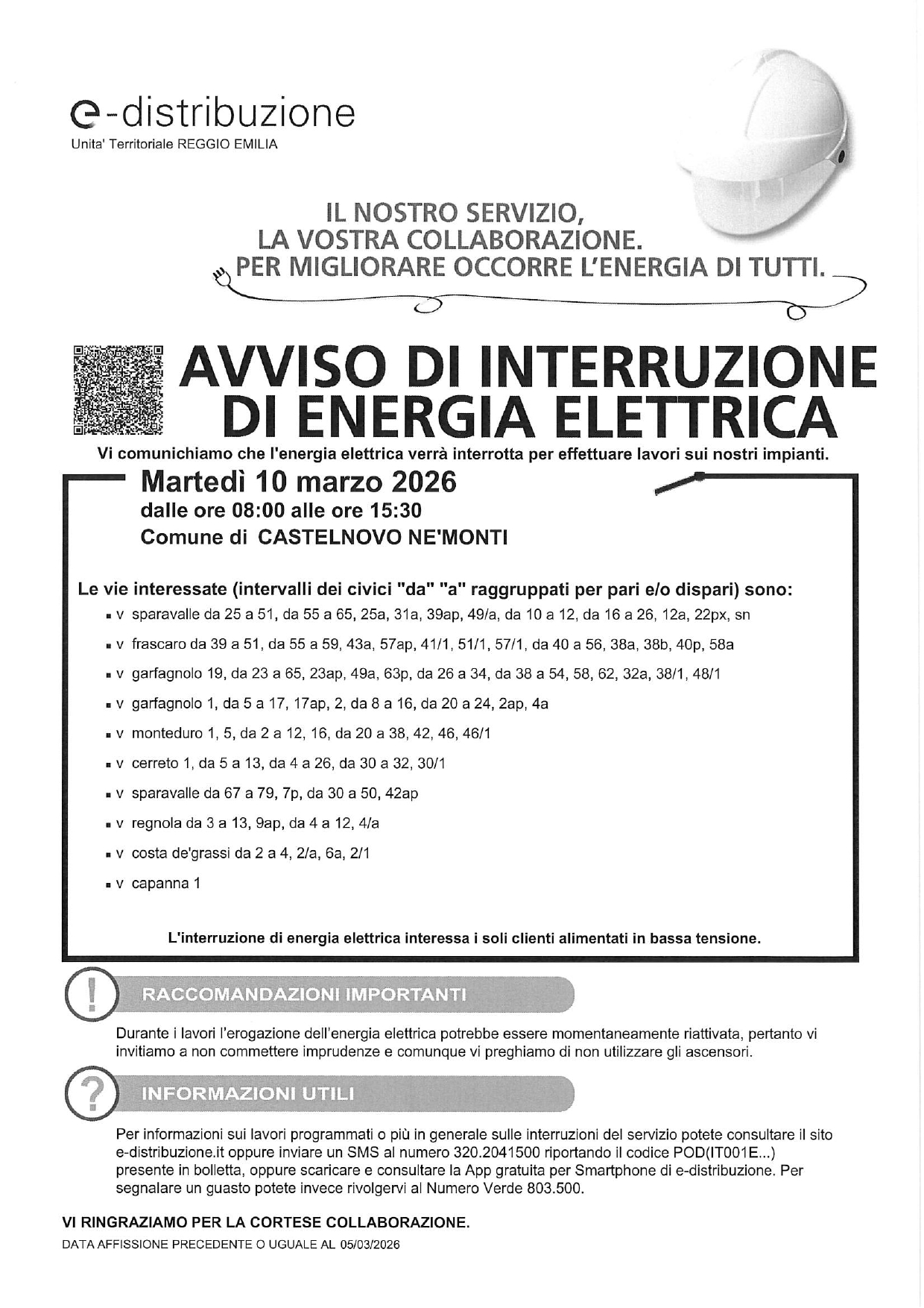 Si informa la cittadinanza che, come comunicato da e-distribuzione – Unità Territoriale di Reggio Emilia – nella giornata di martedì 10 marzo 2026, dalle ore 8.00 alle ore 15.30, sarà interrotta l’energia elettrica per consentire l’esecuzione di lavori sugli impianti.