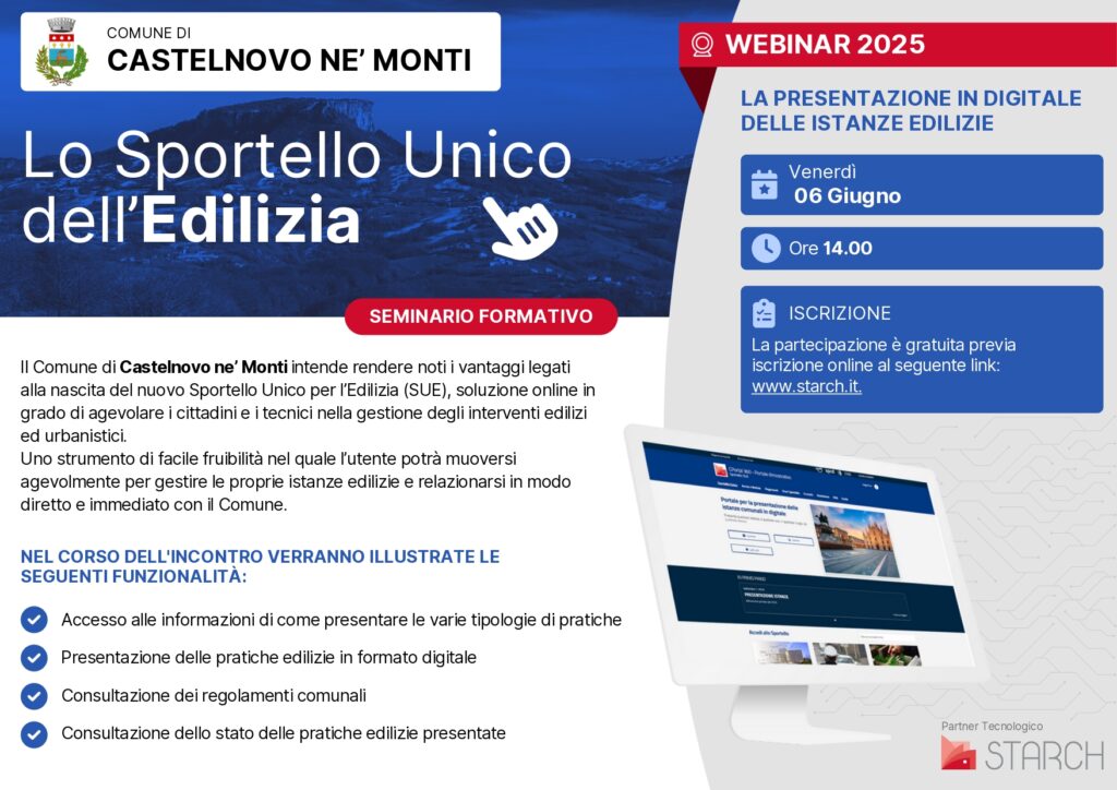 Il Comune di Castelnovo ne' Monti intende rendere noti i vantaggi legati alla nascita del nuovo Sportello Unico per l'Edilizia (SUE), soluzione online in grado di agevolare i cittadini e i tecnici nella gestione degli interventi edilizi ed urbanistici. Uno strumento di facile fruibilità nel quale l'utente potrà muoversi agevolmente per gestire le proprie istanze edilizie e relazionarsi in modo diretto e immediato con il Comune. E' previsto l'incontro online secondo le modalità seguenti: