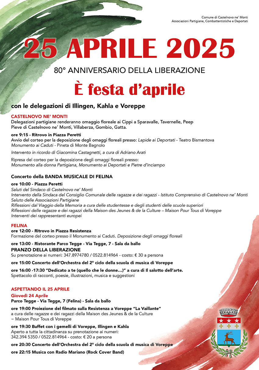 Il 25 aprile sarà una giornata di festa insieme alle delegazioni di Illingen, Kahla e Voreppe, tutti i comuni gemellati con Castelnovo. Al mattino presto le delegazioni partigiane renderanno omaggio floreale ai Cippi a Sparavalle, Tavernelle, Peep - Pieve di Castelnovo Monti, Villaberza, Gombio, Gatta. Alle ore 9.15 ci sarà il ritrovo in piazza Peretti e l’avvio del corteo per la deposizione degli omaggi floreali presso la lapide ai Deportati al Teatro Bismantova e al Monumento ai Caduti nella pineta di Monte Bagnolo. Qui è previsto un intervento in ricordo della partigiana Giacomina Castagnetti a cura del giornalista Adriano Arati. Il corteo poi riprenderà per la deposizione degli omaggi floreali al monumento alla donna Partigiana nel parco vicino a Palazzo Ducale, il Monumento ai Deportati all’Isolato Maestà e in corrispondenza delle Pietre d’inciampo in paese. Il corteo sarà accompagnato dalla Banda musicale di Felina. Alle ore 10 in Piazza Peretti ci saranno i saluti del Sindaco di Castelnovo Monti Emanuele Ferrari, il saluto delle Associazioni Partigiane portato da Nello Wassili. Seguiranno le riflessioni dei ragazzi che hanno partecipato al Viaggio della Memoria: per la 5^T dell’Istituto Mandela parlerà Camilla Cabassi; per la 5^F del Cattaneo - D’Allaglio Samuele Pinelli e Federico Lanzi; per la 5^M Camilla Benassi e Valentina Coli; le ragazze e dei ragazzi della Maison des Jeunes & de la Culture – Maison Pour Tous di Voreppe. Infine gli interventi dei rappresentanti dei Comuni gemellati con Castelnovo: il Sindaco di Voreppe, Luc Remond; il Sindaco di Kahla, Jan Schonfeld; il presidente del Comitato gemellaggi di Illingen, Rudolf Krauth.