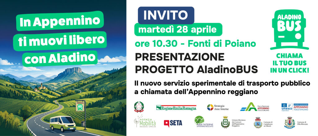 Sarà presentato ufficialmente martedì 28 aprile alle ore 10.30, presso la struttura turistica delle Fonti di Poiano, il nuovo servizio di trasporto pubblico “a chiamata” AladinoBUS, promosso dall’Agenzia per la Mobilità di Reggio Emilia in collaborazione con l’Unione dei Comuni e le amministrazioni comunali di Villa Minozzo e Castelnovo Monti.