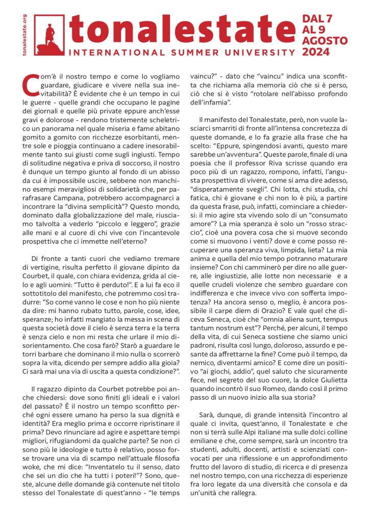 Aggiunge il Sindaco di Castelnovo Monti, Emanuele Ferrari: “Per prima cosa vogliamo ringraziare gli organizzatori di Tonalestate per aver scelto Castelnovo e il nostro Appennino come teatro della 25^ edizione. Una scelta che racconta la forza invisibile delle radici di questo progetto che nasce dal pensiero, dalle idee e dalle azioni del professor Giovanni Riva, e che oggi ci porta il mondo, qui da noi, in tutta la sua vitale complessità. Sarà credo un'occasione altissima per misurarsi con temi di portata universale e di stridente, a tratti anche preoccupante attualità, ma che siano i giovani a esserne coinvolti, a cercare insieme ai loro maestri possibili risposte, per vivere davvero questo tempo "fuori di sesto", e non semplicemente consumarlo, credo sia la cifra che ci aiuta a sperare e costruire un tempo nuovo, una dimensione umana e creatrice, dove gli esseri viventi possano dialogare e riconoscersi, come parti essenziali di un tutto. Il programma della tre giorni è di livello assoluto, non vediamo l'ora di accogliervi e metterci in ascolto”.