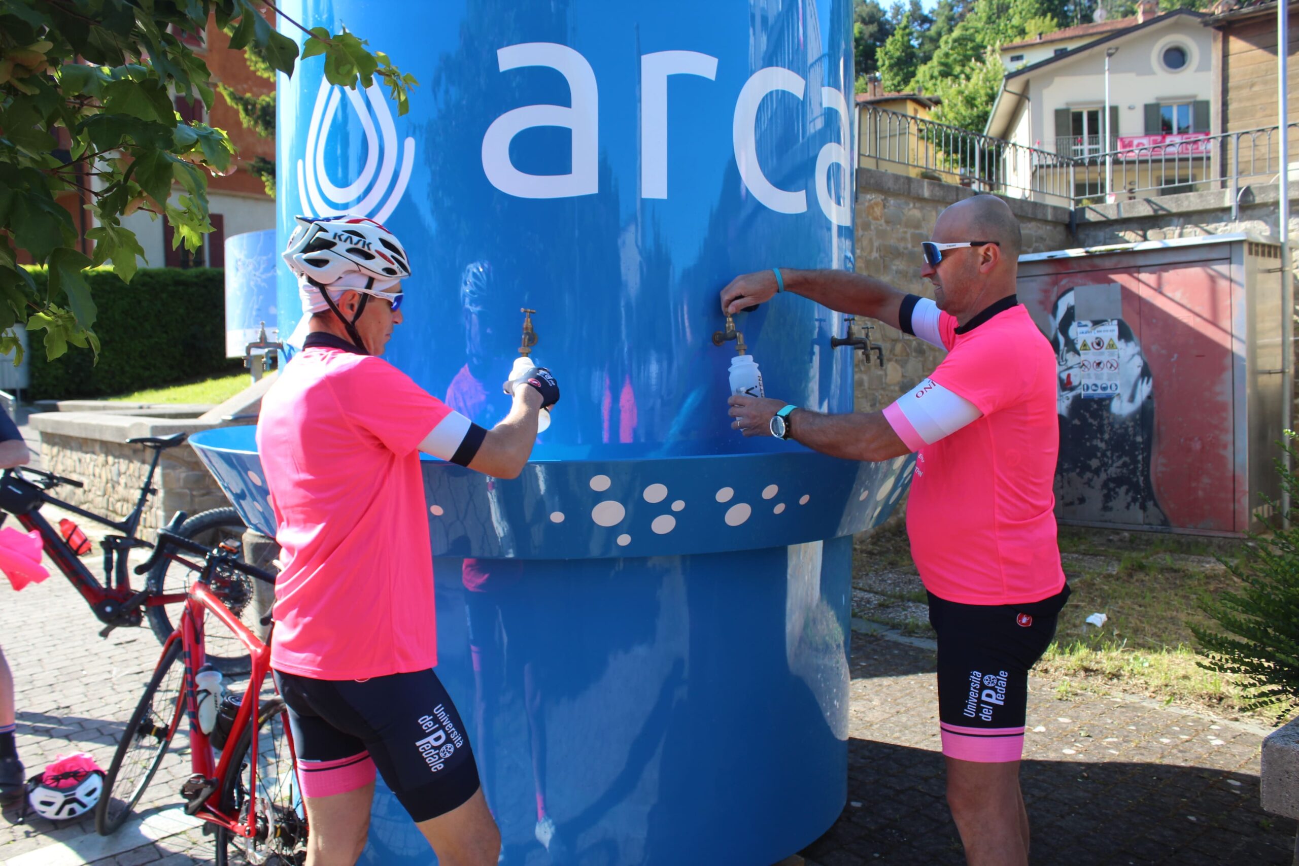 Si son ritrovati tutti in maglia rosa al fontanone che ARCA ha installato in Piazza Gramsci dove mercoledi in occasione dell’arrivo di tappa a Castelnovo Monti sorgerà il villaggio di Giroland. Hanno riempito le borracce con l’Acqua della Gabellina della rete pubblica della montagna e sono partiti per una pedalata in compagnia sulle strade del Giro d’Italia. In sella a biciclette muscolari, e-bike, ma anche mountain bike e tandem, ogni gruppetto di ciclisti e cicloturiste ha scelto il percorso, la distanza ed il dislivello più adatto alle proprie abitudini e capacità con in tasca gli stick di Parmigiano Reggiano offerti dalla sezione soci del Consorzio di Reggio Emilia. I gruppi più numerosi che hanno preso parte all’iniziativa “Facciamo in Giro insieme” sono stati quelli caratterizzati da ciclisti dell’Università del Pedale di Castelnovo ne’ Monti e quelli delle associazioni sportive di Scandiano e di Reggio Emilia.