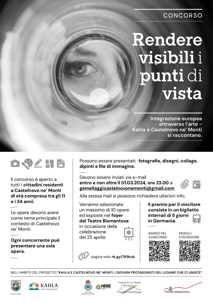 Sono ancora aperti i termini per partecipare al concorso artistico rivolto ai giovani, dagli 11 ai 34 anni, promosso nell'ambito del progetto “Kahla e Castelnovo ne' Monti. I giovani protagonisti del legame che ci unisce”. A promuovere l’iniziativa sono il Comitato Gemellaggi di Castelnovo, il Comune di Castelnovo e il Comune di Kahla (Germania, nella regione della Turingia): l’importante concorso artistico si intitola "Rendere visibili i punti di vista", e ha l’obiettivo di arrivare a una più profonda integrazione europea attraverso l’arte, una conoscenza reciproca delle identità delle due comunità, delle rispettive caratteristiche culturali, sociali, legate alle tradizioni e alla storia. Il concorso rientra nell'ambito del progetto “Kahla e Castelnovo ne' Monti. I giovani protagonisti del legame che ci unisce”, per il quale i due comuni hanno ricevuto il Premio dei Presidenti per la cooperazione comunale tra Italia e Germania. La partecipazione è aperta a tutti i cittadini residenti a Castelnovo di età compresa tra gli 11 e i 34 anni, attraverso opere quali fotografie, disegni, collage, dipinti e file di immagine. Le opere vanno presentate entro il 1 marzo 2024, la selezione e il giudizio avranno luogo entro la fine dello stesso mese a cura di una giuria composta da artisti e fotografi locali. Sono stati chiamati a farne parte Gloria Vannicelli, Ermanno Beretti, Mimmo Reverberi, Debora Costi e Simona Sentieri. Le opere devono avere come tema principale il contesto di Castelnovo, e ogni concorrente può presentare una sola opera, da inviare tramite e-mail entro e non oltre il 1 marzo (ore 23) a gemellaggicastelnovonemonti@gmail.com. Alla stessa mail si possono richiedere ulteriori info, mentre il regolamento completo è a disposizione sul sito istituzionale del Comune di Castelnovo (www.comune.castelnovo-nemonti.re.it). Verranno selezionate un massimo di 10 opere per comune che a Castelnovo saranno esposte nel foyer del teatro in occasione delle celebrazioni del 25 aprile. Il premio per il vincitore sarà un biglietto Interrail di 5 giorni in Germania. “Invito ancora una volta ragazze e ragazzi di Castelnovo a partecipare numerosi a questa bella iniziativa – afferma l’Assessore ai gemellaggi di Castelnovo, Lucia Manfredi – dando libero sfogo alla loro creatività, perché ci interessa fortemente il loro punto di vista sulle amicizie europee, e soprattutto su come percepiscono il loro territorio e come vorrebbero farlo conoscere agli altri”.