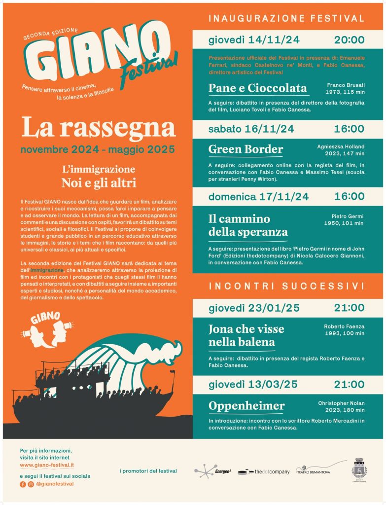 “L'immigrazione. Noi e gli altri”. È questo il titolo della seconda edizione del Festival cinematografico Giano, che vive nei prossimi giorni la sua seconda edizione tra il Teatro Bismantova di Castelnovo Monti e il Cinema Rosebud di Reggio Emilia, ampliando la sua portata territoriale dopo la prima edizione partita lo scorso anno. Le giornate centrali saranno da giovedì 14 a domenica 17 novembre. Tutti gli eventi del festival sono ad ingresso gratuito. Giano nasce dall'idea che guardare un film, analizzare e ricostruire i suoi meccanismi, possa insegnare a pensare e ad osservare il mondo. La lettura di un film, accompagnata dai commenti e una discussione con ospiti, ha l’obiettivo di favorire il dibattito su temi scientifici, sociali e filosofici. II Festival si propone di coinvolgere studenti e grande pubblico in un percorso educativo attraverso le immagini, le storie e i temi che i film raccontano: da quelli più universali e classici, ai più attuali e specifici. La seconda edizione del Festival è dedicata al tema delle migrazioni, attraverso la proiezione di film ed incontri con i protagonisti che quegli stessi film li hanno pensati o interpretati, e con dibattiti a seguire insieme a importanti esperti e studiosi, nonché a personalità del mondo accademico, del giornalismo e dello spettacolo.