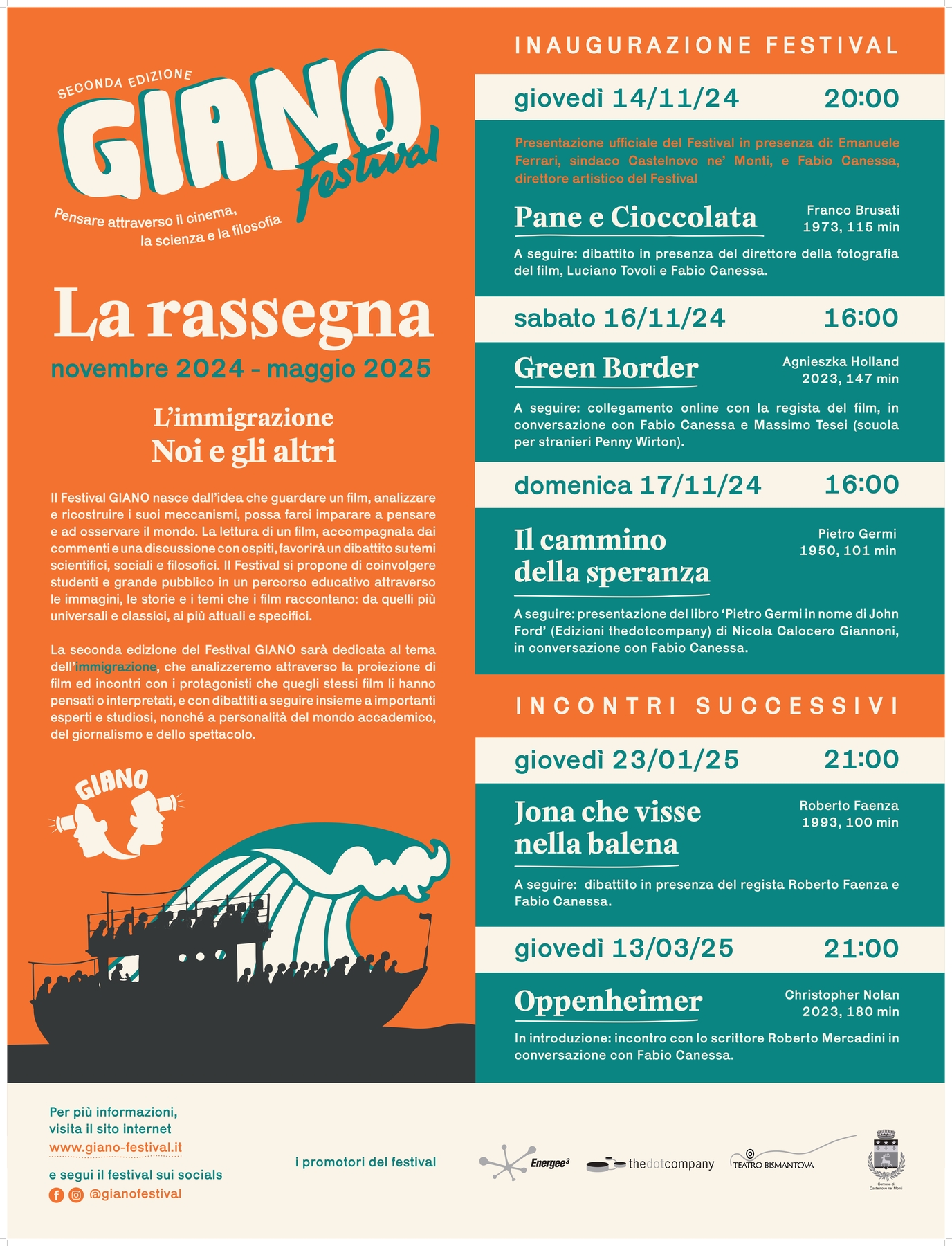 Il festival proseguirà poi con altri appuntamenti nei mesi di gennaio e marzo 2025. Il programma completo è disponibile sul sito www.giano-festival.it. Sull’importanza dell’evento afferma l’assessore alla cultura di Castelnovo, Erica Spadaccini: “Questa importante iniziativa viene proposta dal Comune insieme alla società Energee3 di servizi e consulenza ICT, e la casa editrice The Dot Company. Anche quest’anno vorremmo far riflettere sull’importanza educativa del Cinema, sul suo ruolo di testimone e veicolatore di temi di enorme importanza del presente, anche quando parliamo di pellicole ormai storiche e autori come Pietro Germi che comunque hanno dimostrato di avere uno sguardo capace di anticipare i tempi. Quelli legati alle migrazioni sono argomenti che segnano il nostro tempo, spesso come motivi di speculazioni e strumentalizzazioni politiche, mentre è importante ricordare sempre che coinvolgono e stravolgono le vite di migliaia di persone, tra le più povere del pianeta, che si trovano a dover fuggire da guerre e carestie. Invitiamo tutti a partecipare a queste proiezioni ed incontri, sempre ad ingresso gratuito, che animano ancora una volta il Teatro Bismantova, che si conferma una casa della cultura, nel senso più ampio del termine, per tutta la montagna”.