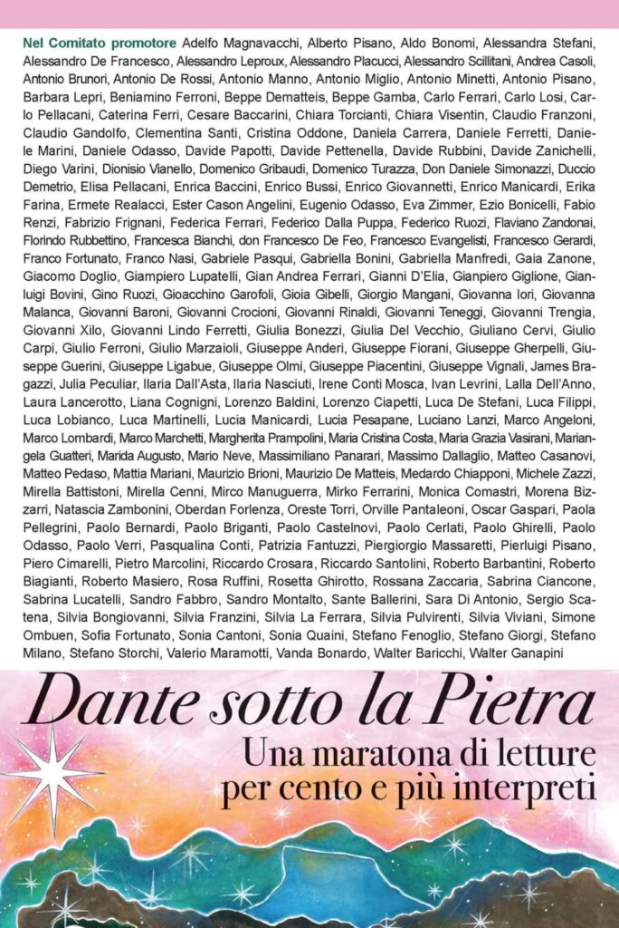 Una maratona letteraria per dare voce a cento e più interpreti, espressione di una moltitudine articolata, chiamato ciascuno a leggere un canto o un brano della Commedia. Una moltitudine fatta di personaggi autorevoli e di gente comune; di protagonisti della cultura e dello spettacolo; di donne e uomini di scienza e di letteratura; di portatori e portatrici di responsabilità politiche; di influencer di nuovo e di vecchio stampo; di studenti, agricoltori, pastori, artigiani; di giovani e meno giovani impegnati nelle attività di cura delle persone e delle terre, a partire da quelle alte.