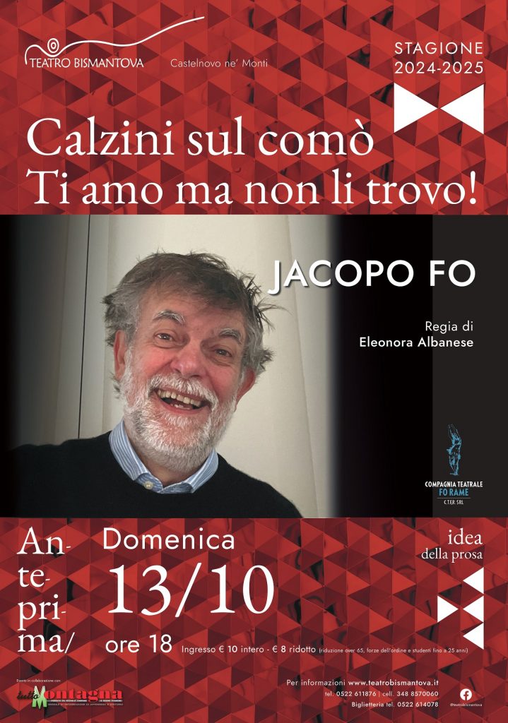 "Calzini sul comò (Ti amo ma non li trovo!)" è un monologo teatrale che combina umorismo e riflessioni personali, affronta temi di amore e relazioni in un modo incalzante e coinvolgente. Attraverso aneddoti e situazioni comiche, Jacopo Fo esplora le complessità delle relazioni umane, utilizzando il suo stile caratteristico di narrazione per intrattenere e far riflettere il pubblico. È un lavoro che continua la tradizione artistica della sua famiglia, rimanendo fedele ai valori sociali e culturali che caratterizzano la sua carriera. "Recitare I calzini sul comò al Teatro Bismantova è un’esperienza speciale – racconta Fo - il teatro diventa un rifugio dove l'arte e la vita quotidiana si fondono, proprio come i calzini che si perdono e si ritrovano”. Fo si definisce un'autorità internazionale nel dolore amoroso, con esperienze che lo portano a condividere con il pubblico la sua sagacia. Con un umorismo affilato, analizza le domande trabocchetto nelle relazioni, come il famoso “Ti sembro ingrassata?”. “Qualunque risposta io ti dia, sono un uomo morto,” afferma. Ingresso allo spettacolo: 10 euro intero, 8 euro ridotto (riduzione over 65, forze dell’ordine e studenti fino a 25 anni). Per informazioni www.teatrobismantova.it, tel. 0522 611876, cell. 348 8570060. Biglietteria tel. 0522 614078.