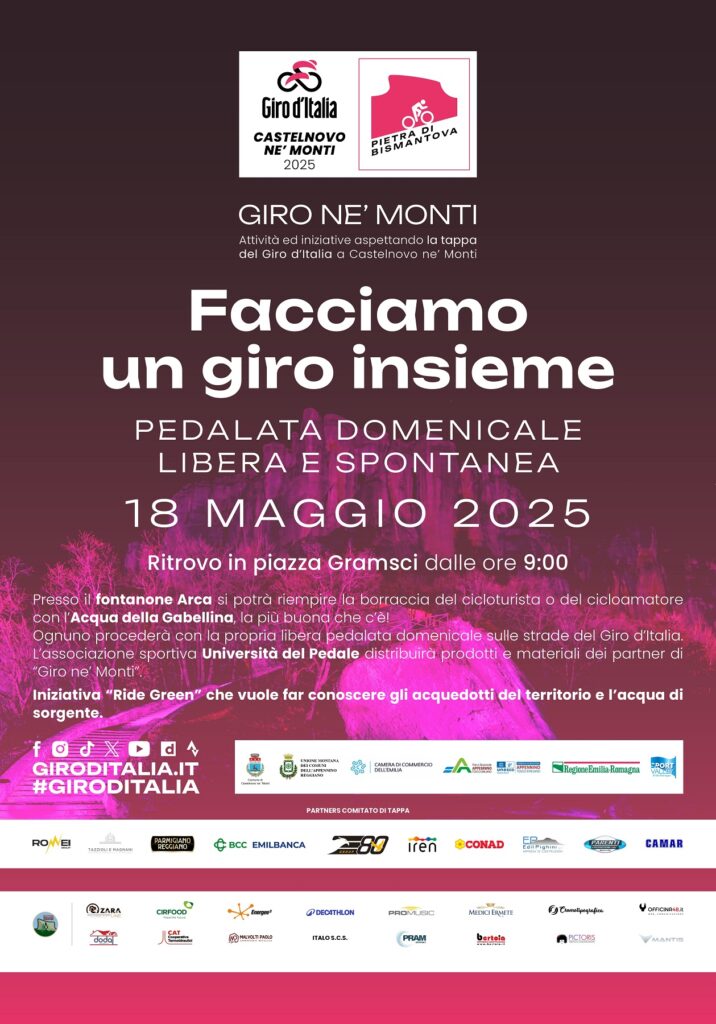 S’intitola significativamente “Facciamo un Giro insieme” l’evento in programma domenica, 18 maggio, inserito nel cartellone di attività in vista dell’arrivo di tappa a Castelnovo Monti del Giro d’Italia, il 21 maggio. L’iniziativa domenicale sarà una pedalata libera e spontanea, con ritrovo in piazza Gramsci dalle ore 9. Presso il fontanone Arca si potrà riempire la borraccia del cicloturista o del cicloamatore con l’Acqua della Gabellina. Poi si partirà lungo le strade della 11^ tappa del Giro d’Italia. Ognuno procederà con il proprio ritmo, senza fretta, per assaporare il territorio appenninico. L'associazione sportiva Università del Pedale distribuirà prodotti e materiali dei partner di “Giro ne’ Monti”.
