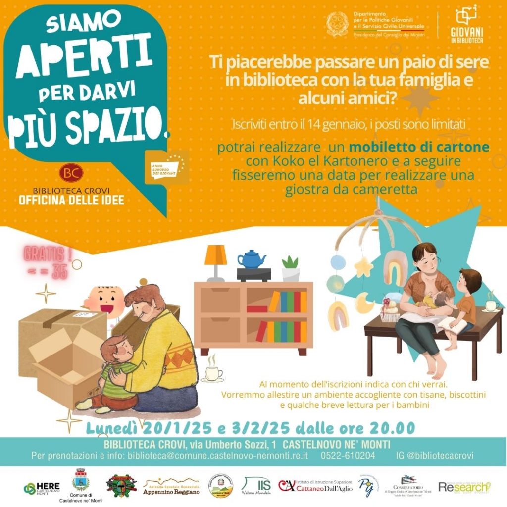 Grazie all’importante finanziamento ricevuto, la Biblioteca Crovi (momentaneamente sita in via Sozzi 1, nello stabile delle scuole medie di Castelnovo ne’ Monti) ha potuto in questi mesi ampliare il personale e l’orario di apertura, può acquistare attrezzature e arredi e promuove, organizza e coordina attività ludico-ricreative, sociali, educative, culturali e formative, per un buon utilizzo del tempo libero dei giovani della montagna.
