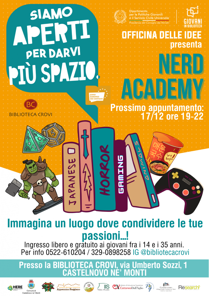 - Nerd Academy (vedi locandina allegata) Gruppo di appassionati della cultura nerd che si incontra a cadenza bimensile per momenti di confronto e discussione su graphic novel, manga, fumetti, anime, film di animazione, per creare una lista di consigli di lettura consultabile sulla pagina Instagram della Biblioteca Crovi e progettare attività ispirate alla cultura nerd. Il prossimo incontro, aperto a tutti gli interessati, sarà il 17/12 dalle ore 19:00 alle 22:00.