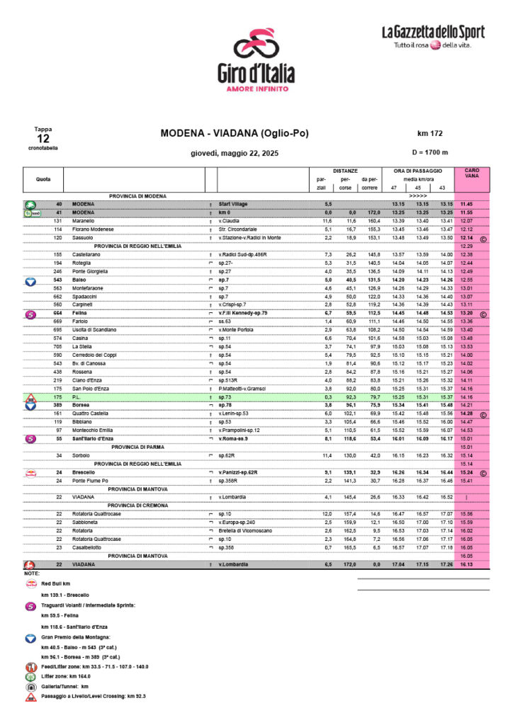 Giro d’Italia in Appennino il 21 e 22 maggio: le cronotabelle con gli orari dei vari passaggi