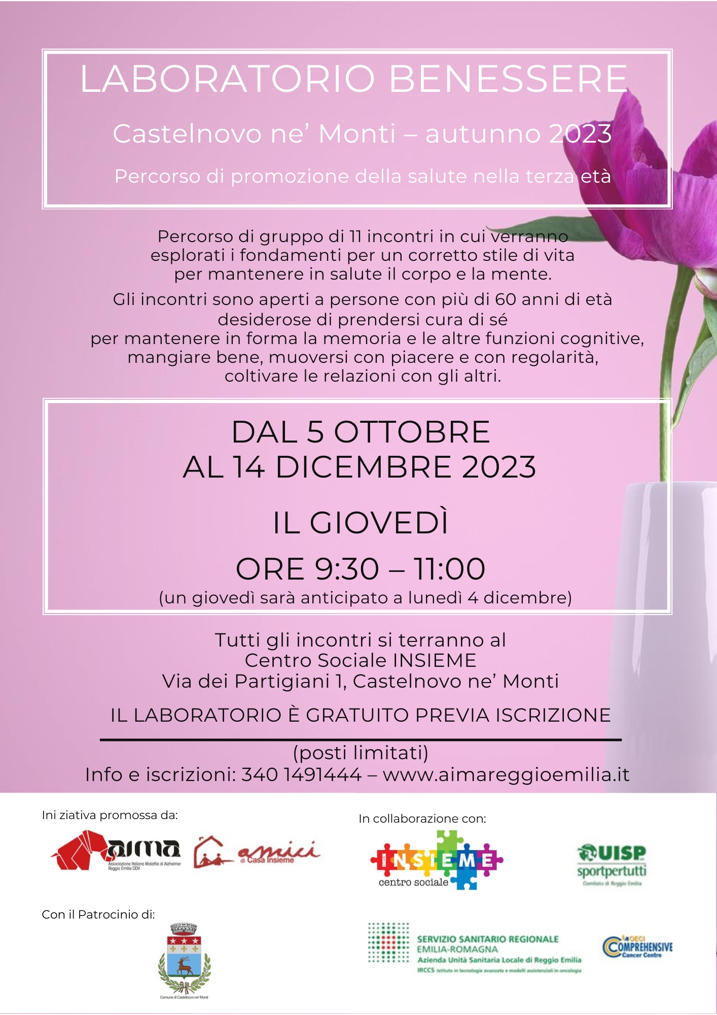 Dal 5 ottobre al 14 dicembre 2023, tutti i giovedì dalle 9.30 alle 11 si terranno gli incontri del Laboratorio Benessere a Castelnovo nei locali del Centro Sociale Insieme.