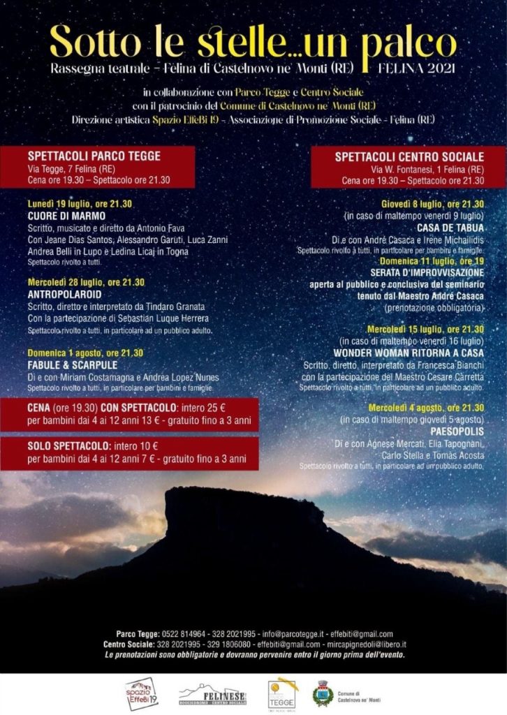 Anche stavolta saranno il Parco Tegge e il Centro Sociale le location di Felina che accoglieranno gli spettacoli: sei appuntamenti tra luglio e i primi di agosto, con alcuni dei nomi più interessanti del panorama teatrale italiano, e non solo.