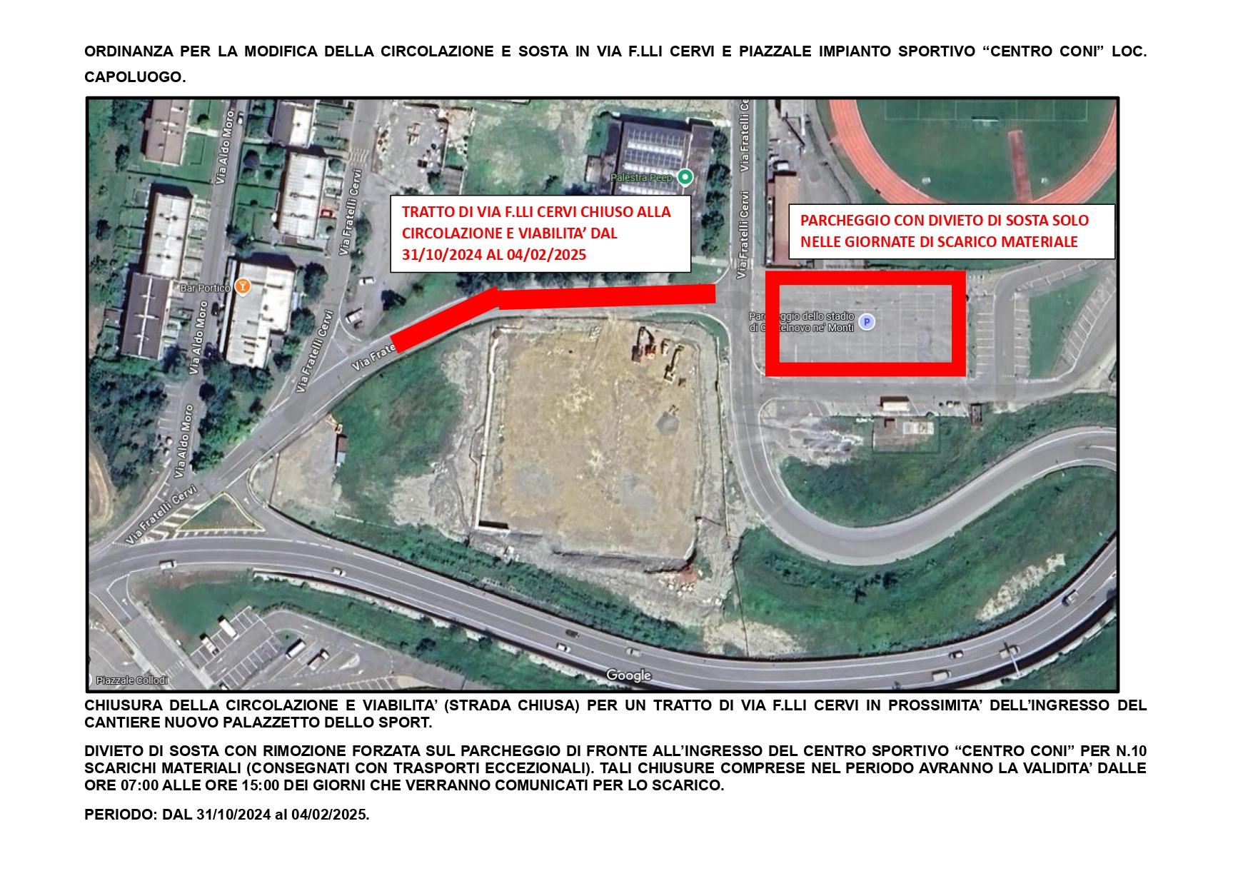 L’ordinanza riguarda la modifica alla circolazione e sosta in via f.lli Cervi e nel piazzale del Centro Coni: viene chiuso al traffico il tratto di via F.lli Cervi che passa tra il cantiere del Palazzetto e la palestra Peep – Pieve, per circa 150 metri complessivi, fino al 4 febbraio 2025. Nel parcheggio del centro Coni scatterà il divieto di sosta solo nelle giornate di scarico materiale per le quali sono previsti in arrivo dei trasporti eccezionali: la chiusura comunque dalle ore 7 alle 15, e sarà mantenuta la viabilità che attraversa il parcheggio per accedere al centro sportivo Onda della Pietra.