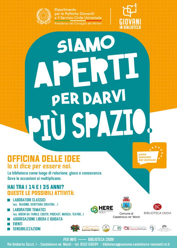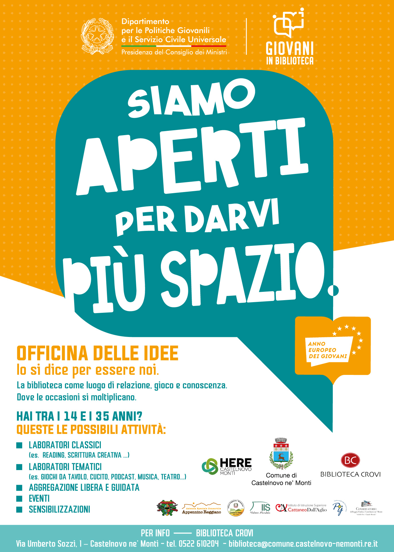 Comincia il progetto "Officina della creatività. Io si dice per essere noi". Si tratta di una serie di attività che nei prossimi 18 mesi riguarderanno la Biblioteca Crovi del Comune Castelnovo Monti, con particolare attenzione al target 14-35 anni.