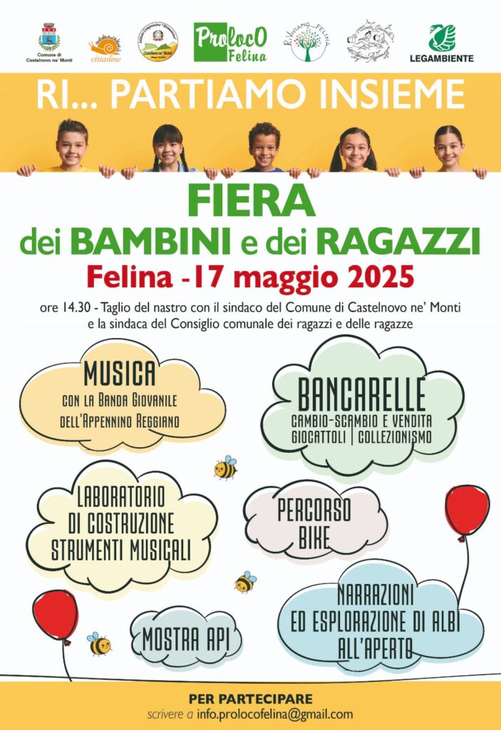 “La fiera dei bambini invece si aprirà alle 14.30 di sabato 17 maggio – spiega la consigliera comunale Tiziana Lanzi, che opera di supporto sulle tematiche legate a scuola, associazionismo e volontariato – con l’inaugurazione della fiera alla presenza del Sindaco Emanuele Ferrari, della Sindaca del Consiglio Comunale dei Ragazzi e delle Ragazze e delle altre autorità. Sarà la Banda Giovanile con sede a Felina ad accompagnare il pomeriggio con intermezzi musicali. Dopo il taglio del nastro, al via tutte le iniziative a cura delle associazioni del paese: laboratori artistici e didattici, narrazioni, bancarelle di scambio e riuso di giocattoli e accessori, laboratori creativi e mostre a cura delle scuole del Comune. Piazza Zanni sarà occupata delle bici con un percorso a cura dell’associazione Riviviamo Felina, in vista dell’arrivo di tappa del Giro d’Italia del 21 maggio, e le postazioni di forze dell’ordine e Croce Verde Castelnovo Monti e Vetto sui temi della sicurezza stradale. L’evento riunisce tutte le associazioni del paese, che hanno voluto partecipare al programma della giornata”. In caso di maltempo l’evento sarà annullato.