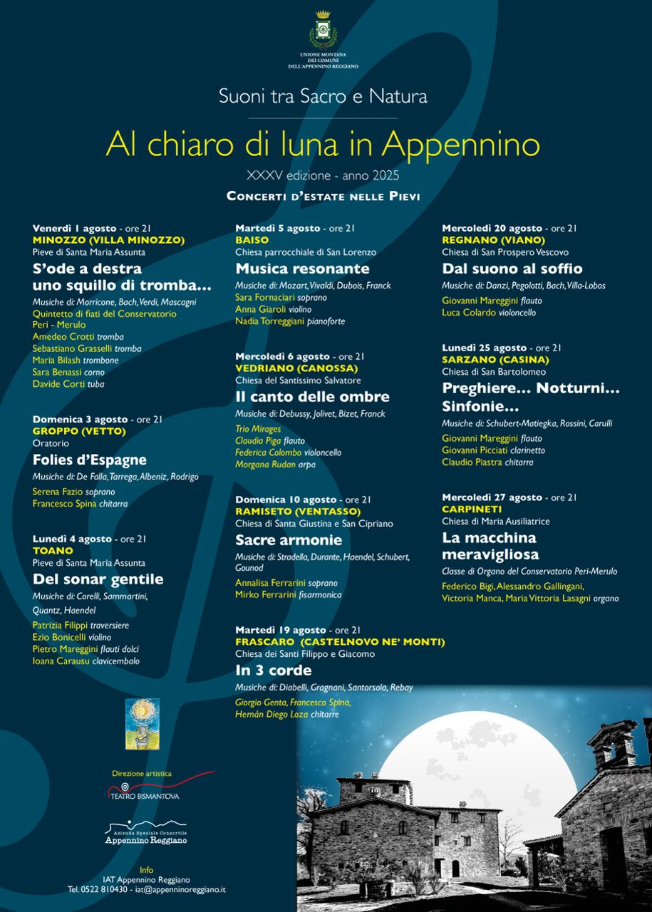 Anche quest’anno le Pievi e le Chiese della montagna reggiana risuoneranno delle note proposte nei Concerti della 35esima edizione de Al Chiaro di Luna in Appennino – Suoni tra Sacro e Natura. Questo ciclo di concerti, che rappresenta la manifestazione più longeva nell’ambito di quelle programmate durante l’estate nell’Appennino Reggiano, è promossa dall’Unione Montana dei Comuni in collaborazione con la Direzione Artistica del Teatro Bismantova di Castelnovo Monti. Afferma il Presidente dell’Unione e Sindaco di Castelnovo Monti, Emanuele Ferrari: “Questa manifestazione conferma non solo la propria longevità, ma anche il livello di qualità davvero altissimo. Un’idea che ha avuto successo perché semplice, ma fortemente autentica e significativa: portare musica con grandi esecutori nei luoghi più belli e preziosi dell’Appennino, non solo dell’Unione ma anche i Comuni di Baiso, Canossa e Viano che condividono con noi la strategia delle Aree Interne. Un ringraziamento a chi ha reso possibile l’edizione 2025, il direttore artistico Giovanni Mareggini e il Teatro Bismantova che ha in capo da ormai molti anni l’organizzazione dell’evento, ma anche a tutti i Comuni che hanno collaborato a scegliere i luoghi dei concerti, e che vogliono investire in cultura per far sì che la musica possa restituire anima ai luoghi”.