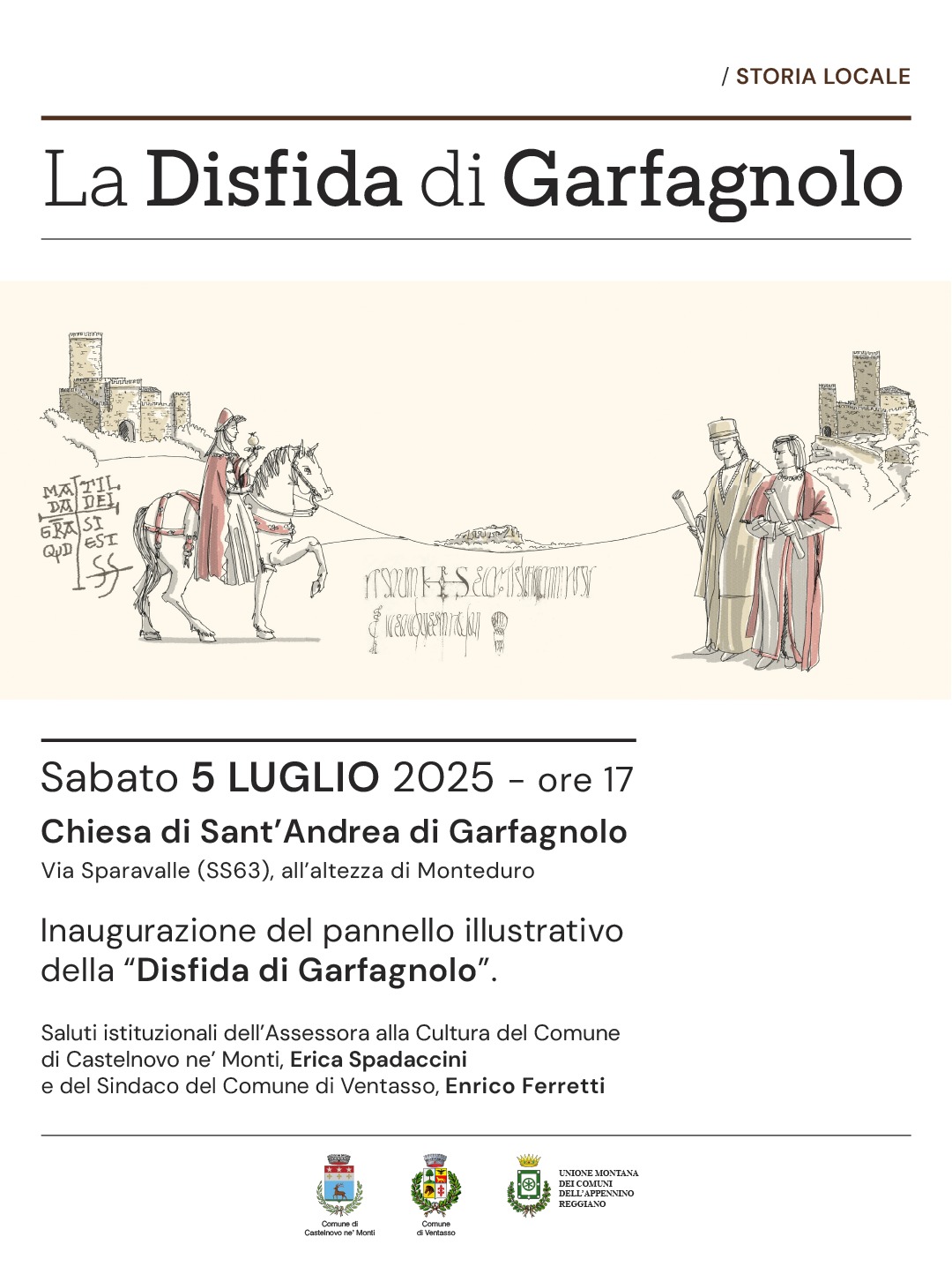 Sabato, 5 luglio, alle ore 17 presso la bellissima chiesa di Sant'Andrea di Garfagnolo (via Sparavalle, statale 63) all'altezza di Monteduro sarà inaugurato un pannello illustrativo della "Disfida di Garfagnolo". Sono previsti gli interventi dell'assessora alla cultura del Comune di Castelnovo Monti, Erica Spadaccini e del sindaco del Comune di Ventasso, Enrico Ferretti. Il 5 luglio 1098, presso Garfagnolo venne discussa una causa di natura patrimoniale che opponeva il monastero reggiano di San Prospero ad una comunità appenninica.
