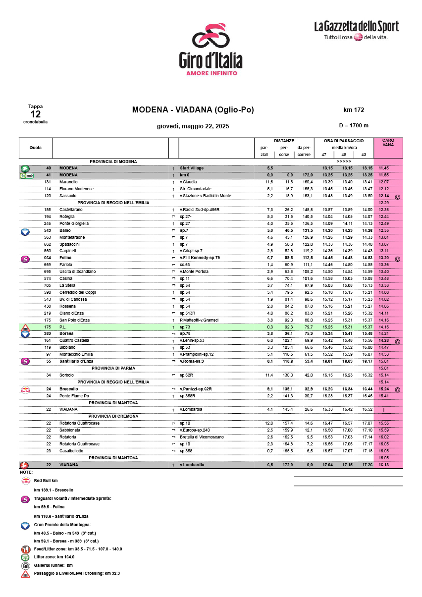 Le cronotabelle delle due tappe del 21 e 22 maggio
